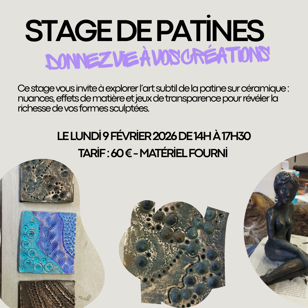 Explorez les effets de matière et les nuances de couleurs pour sublimer vos sculptures. Au programme : Présentation des différents types de patines et pigments Expérimentation des effets sur 3 carreaux texturés que je vous fournis Application sur une sculpture que vous apportez Conseils personnalisés selon vos envies artistiques Ambiance conviviale